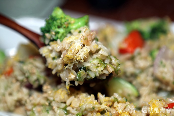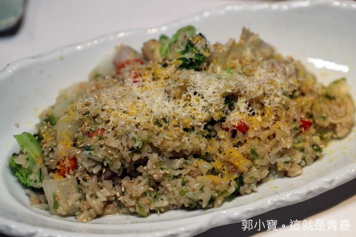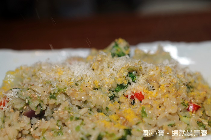 | 這燉飯的整體口感跟味道真的都很特別,口感呈現的介於炒飯跟燉飯的中間,有點像是偏濕潤的炒飯,但是蔬菜的鮮甜味很吸引人,加上烏魚子的香氣跟起司的濃郁,這三者之間搭配得天衣無縫以外,米心呈現的口感也不會偏硬。 |