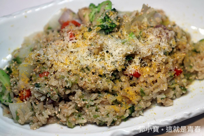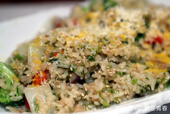 | 這燉飯看起來跟我想像中的燉飯有點連結不起來,看起來第一眼倒像是炒飯的感覺,跟正統的燉飯或是台灣式燉飯都完全不一樣,應該是日式燉飯的感覺居多,因為我在日本也沒有吃過日本的燉飯,所以我不清楚是不是日本的燉飯都是這樣的感覺,除了刨下大量的烏魚子跟起司以外,燉飯本身就還有一些配料,以蔬食為主的燉飯結構。 |