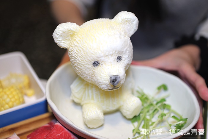 | 這特別的就是麻辣牛奶鍋,這超特別的搭配真的很吸引人,尤其是這隻小熊也太可愛了吧,而且這隻小熊是用肯啃鮮奶特別製作出來的高乳脂的鮮乳直接冷凍成的鮮乳小熊,並非一般市面上用奶精去調和出來的! |
