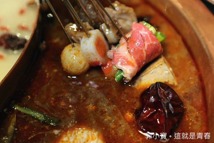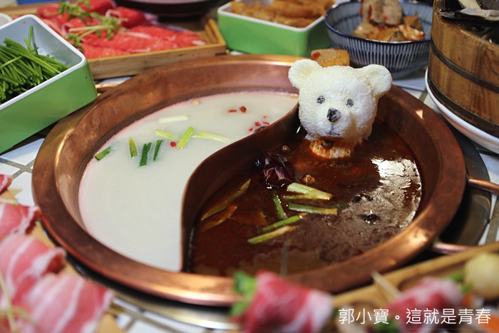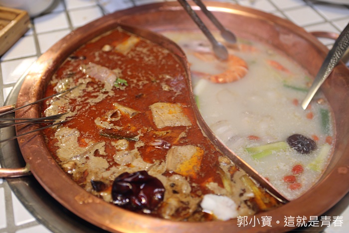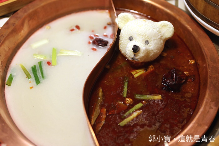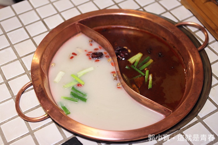 | 除了紫銅火鍋以外現在京四郎也有一般的麻辣火鍋鍋具,我們今天選擇了麻辣牛奶跟豚骨鍋,他們家的麻辣鍋走的是醬香氣比較重的那種,如果喜歡花椒香氣的人可以跟店員說,它們都可以依照客人的需求調整。 |