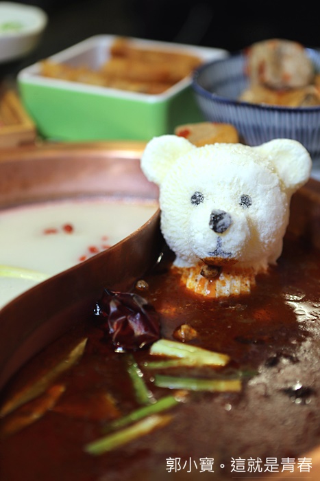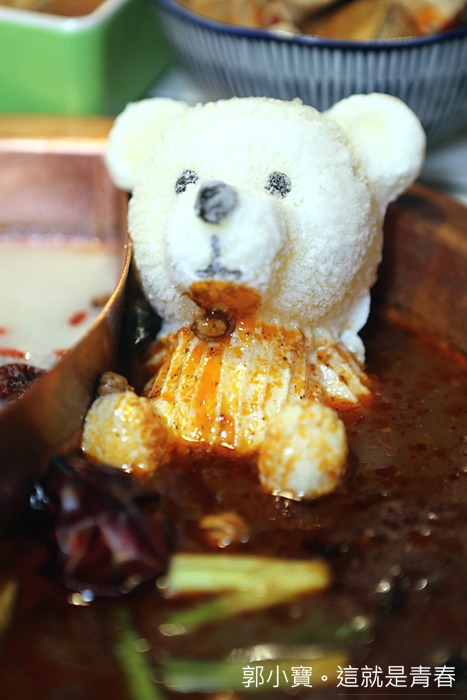 | 立馬把鮮奶小熊放到麻辣鍋中,來宜蘭就是要泡湯阿,鮮奶小熊放在麻辣鍋裡面泡湯的畫面看起來還挺療癒的,一整個超級可愛的,但是可愛歸可愛,還是要來試試看這樣的滋味是不是美味的! |