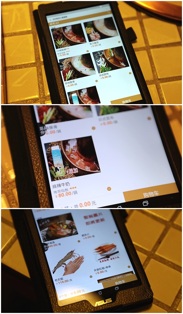 | 京四郎目前都使用小平板點餐,直接動動手指就可以了,這次2.0版的京四郎菜單的部分都只剩鍋物、肉品、海鮮為主,其他的商品都直接去一旁的冰箱直接拿,其中最多人推薦的就是他們家最近超夯的麻辣牛奶鍋,使用鮮乳調出來的麻辣牛奶鍋很吸引人。 |
