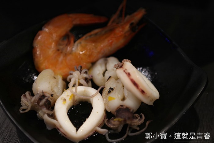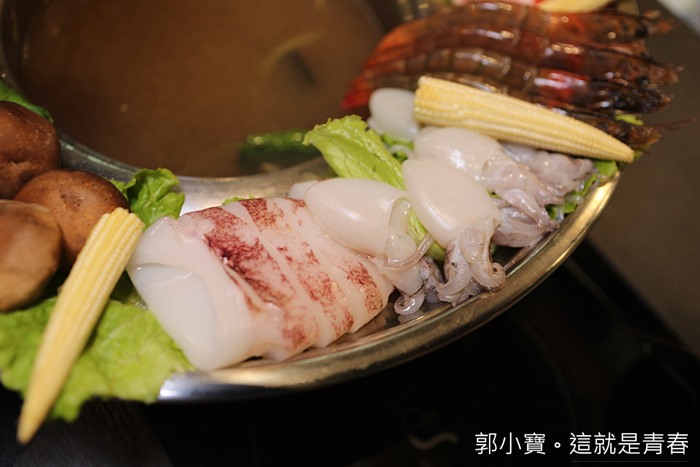 | 基本款的肉品跟海鮮通通都已經在鐵帽鍋上,鐵帽鍋上的肉品是美國胸腹肉肥牛,我個人還滿喜歡這樣的肥牛,還有我很喜歡的海鮮小章魚以及透抽,看起來都相當新鮮,量也給的不少。 |