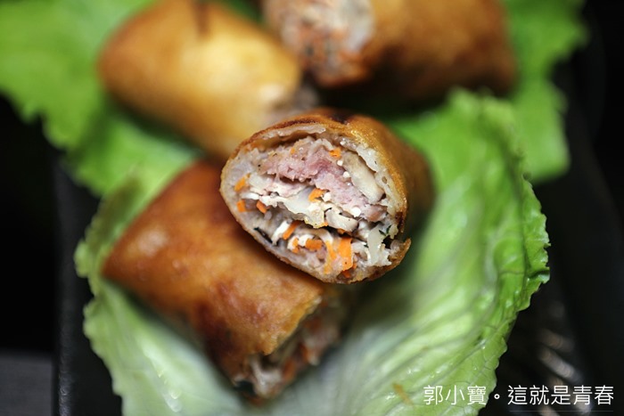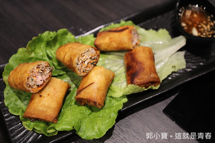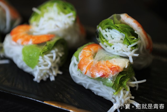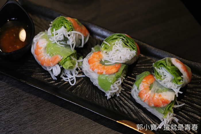 | 越南料理店必點的越式生春捲這邊也可以吃的到,夏天吃一卷越式生春捲真的幸福破表,裡面的米線搭配水煮蝦子,然後再沾點酸辣的酸甜魚露醬真的超解暑,這就是初夏的滋味,隱藏版的就是推薦大家沾是差拉醬,滋味更是與眾不同!! |