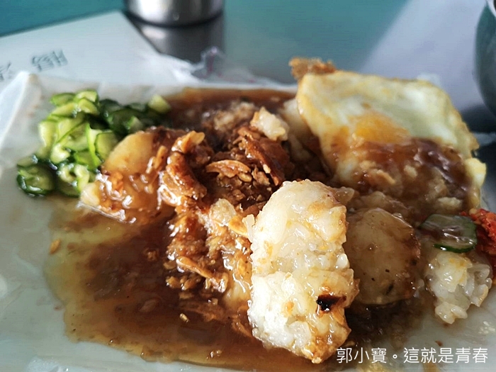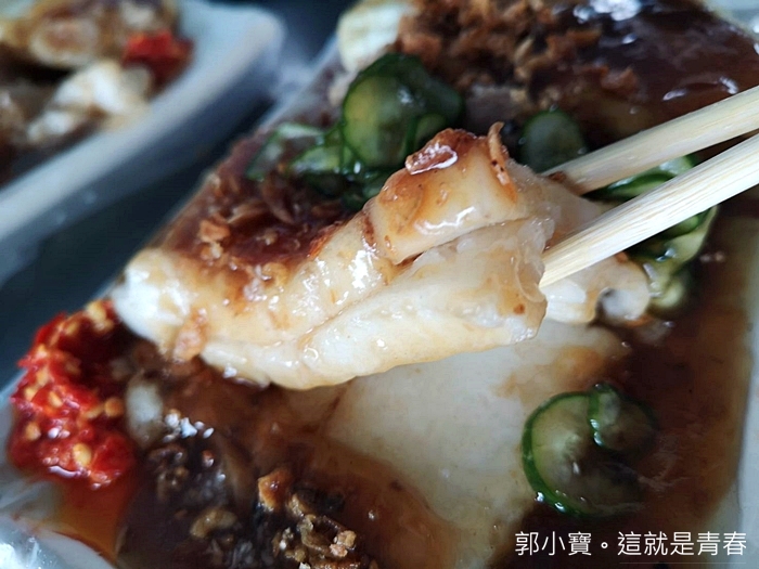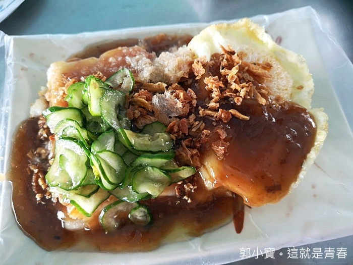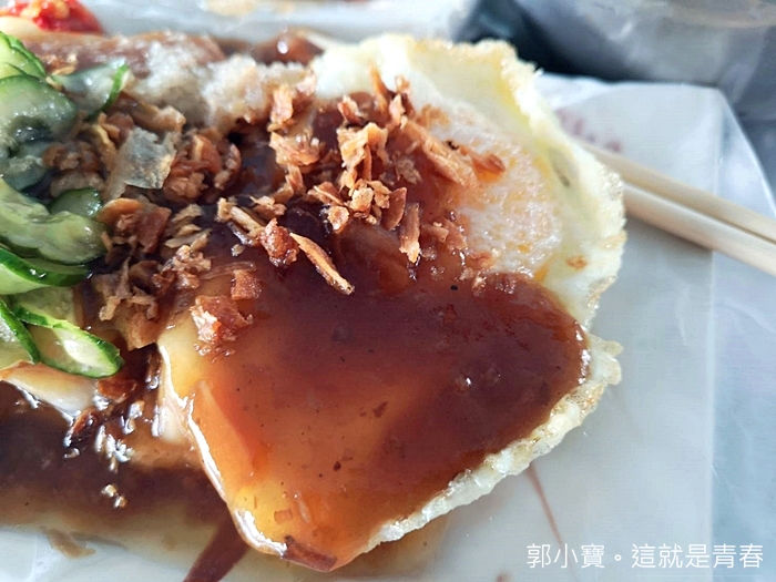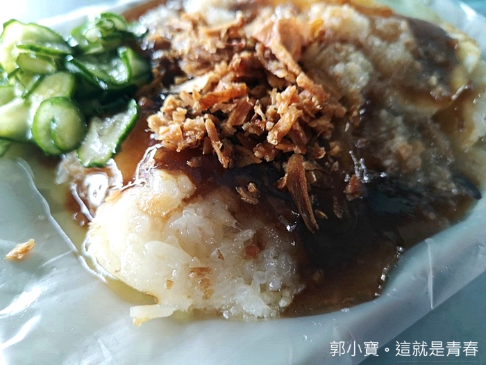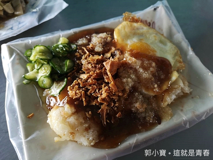 | 這九層粿看起來真的好超值,除了滿滿的九層粿以外還有一顆荷包蛋,另外油蔥給的也很大方,小黃瓜量也很多,尤其是他們的醬油膏是屬於南部口味比較偏甜的那種醬油膏,但是這一家醬油膏除了偏甜還有自己獨特的風味。 |