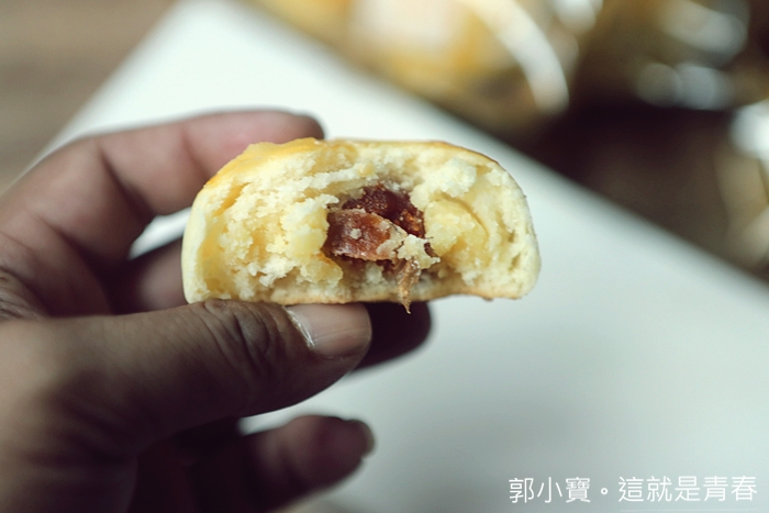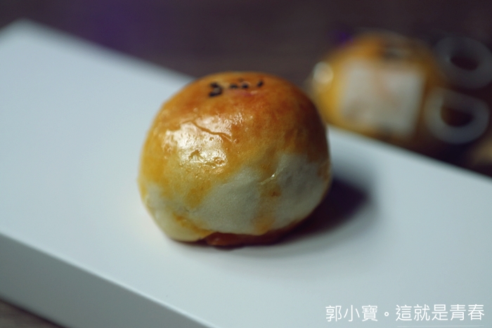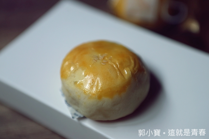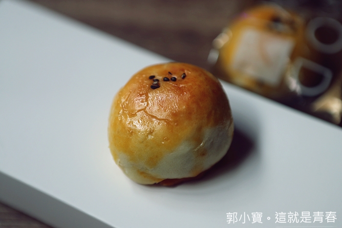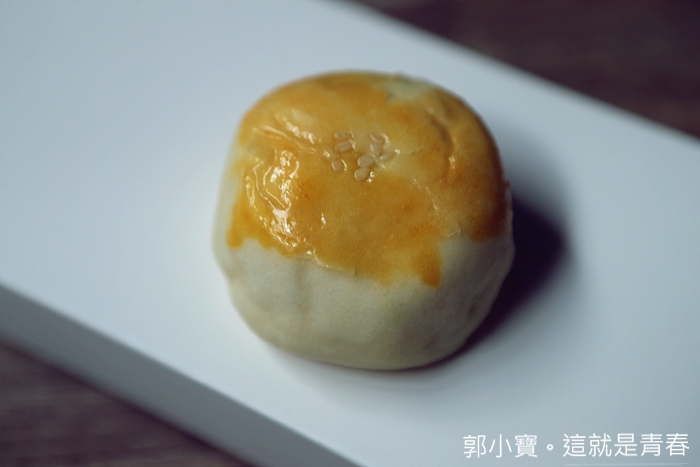 | 上面撒白芝麻的就是烏魚子綠豆椪司康蛋黃酥,份量大小大概已男生大約兩口半就可以吃光,拿起來沉甸甸的,帶點香味,到這邊為止其實都還沒顯現出特別的感覺。 |