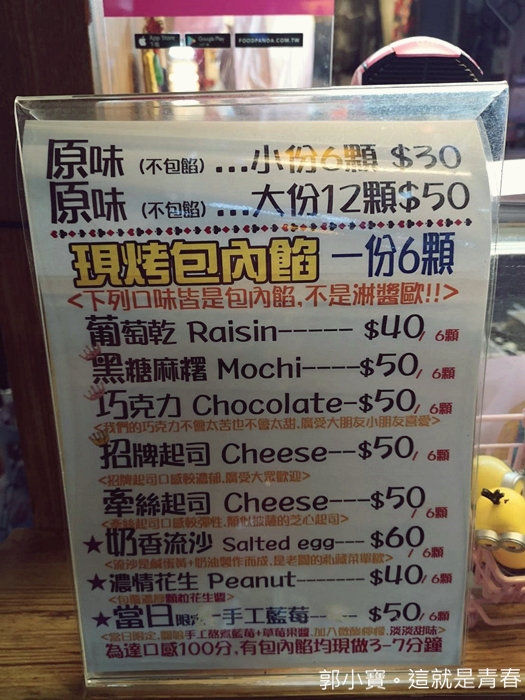 | 九分雞蛋糕口味包含原味總共有9種,變化非常多,價位我覺得還滿便宜的,除了原味以外包餡的雞蛋糕都是50元左右六顆,而且還可以任意搭配,而且她們家有內餡的雞蛋糕都不是淋醬,而是紮紮實實的內餡食材。 |