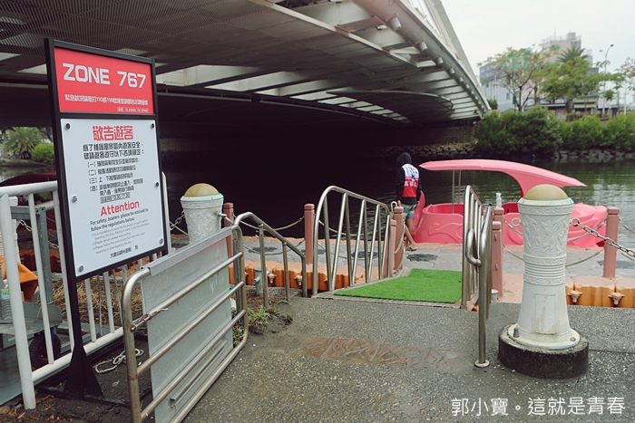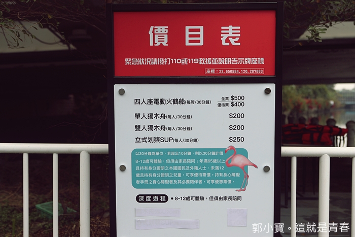 | 下面就是登船口,附上價目表給大家參考,除了電動火鶴船以外還有其他的親水活動,當天因為來搭乘電動火鶴船的人太多,所以我們還小小的排了一下。 |