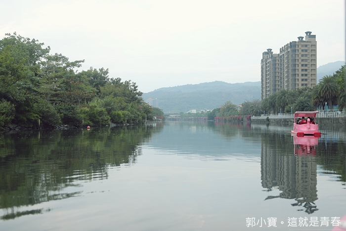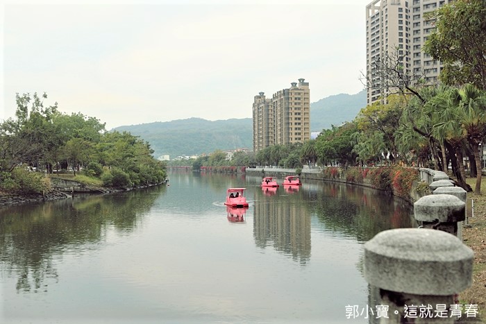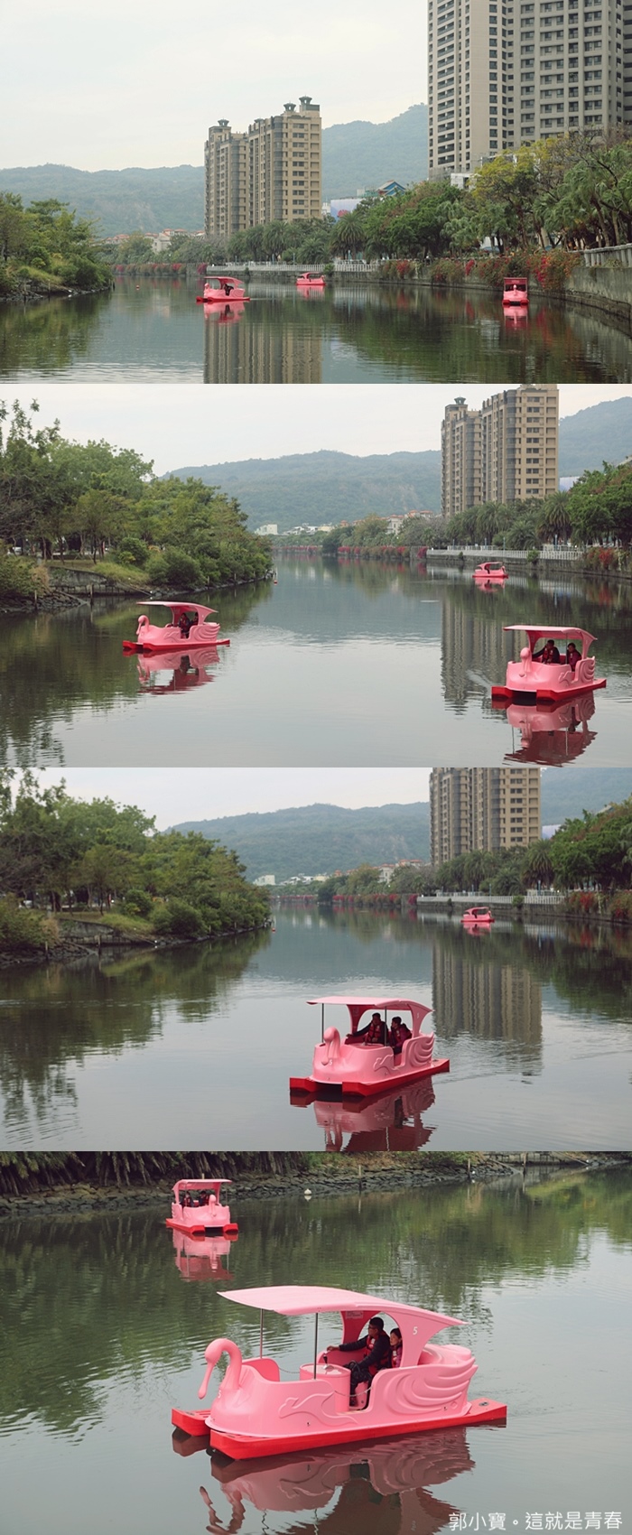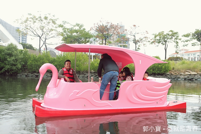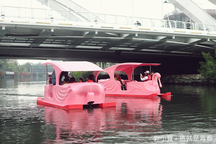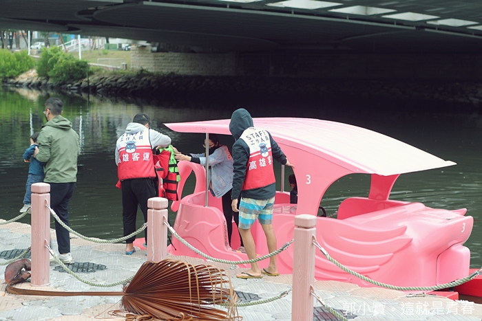 | 過年期間這邊的電動天鵝船幾乎是一船難求,粉紅色的造型真的太吸引人的眼球了,為了跟愛河做結合,所以天鵝船全部都是粉紅色為主,這邊的水上活動除了天鵝船以外也有獨木舟跟立槳,好像是委託給高雄客運公司經營的樣子。 |