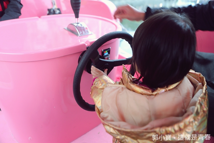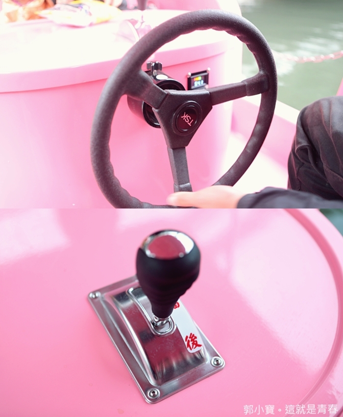 | 駕駛電動火鶴船其實還滿簡單的,除了方向盤以外,排檔的部分就是一個向前一個向後,中間就是熄火停止,操控非常簡單。 |