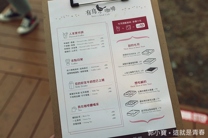 | 價位看起來還滿親民的,除了飲料以外還有吐司,吐司搭配飲料的話還可以現折十元。 |