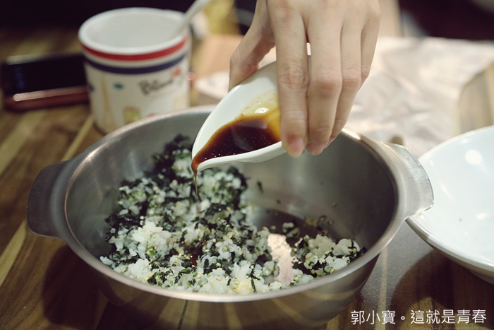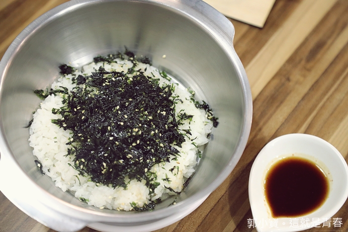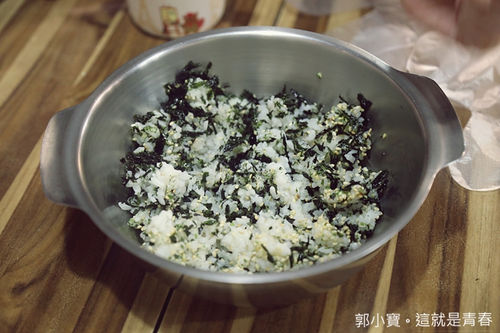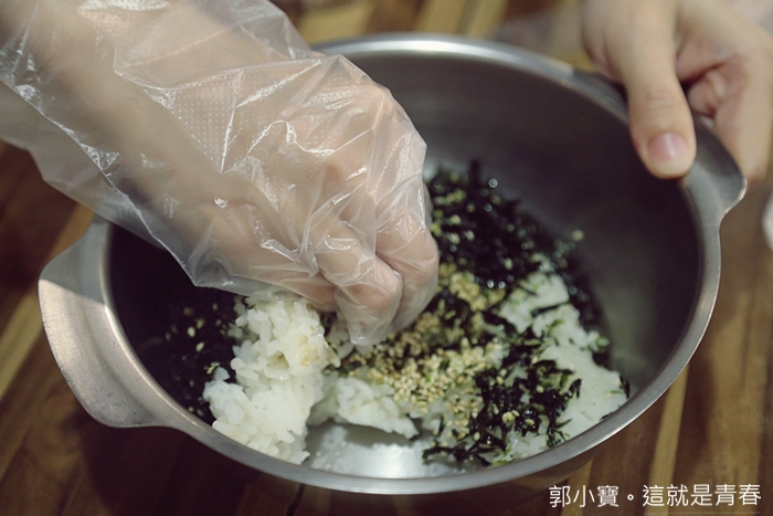 | 自己動手先攪拌,白飯上面有海苔跟白芝麻,稍微攪拌一下再捏成球型即可。 |