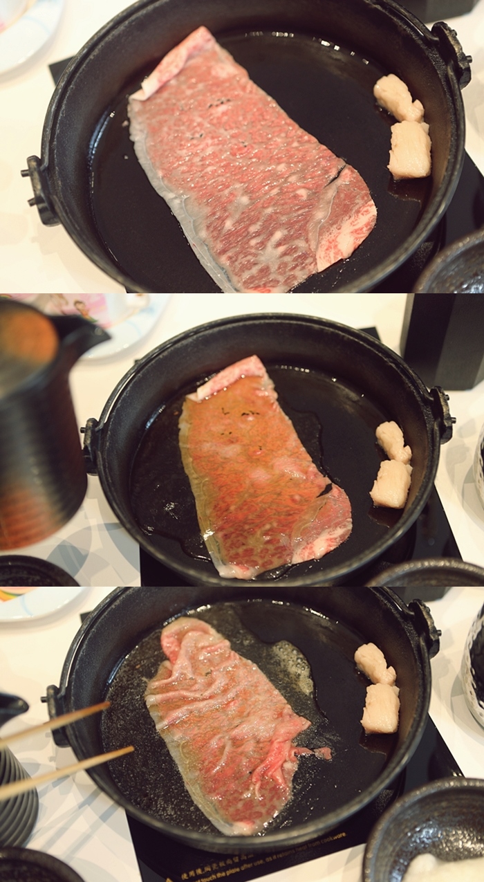| 先將豬油刷上壽喜燒鍋內,日本壽喜燒有分關東跟關西吃法,其實哪一種吃法都無所謂,重點是要好吃比較重要阿XDDDD |
