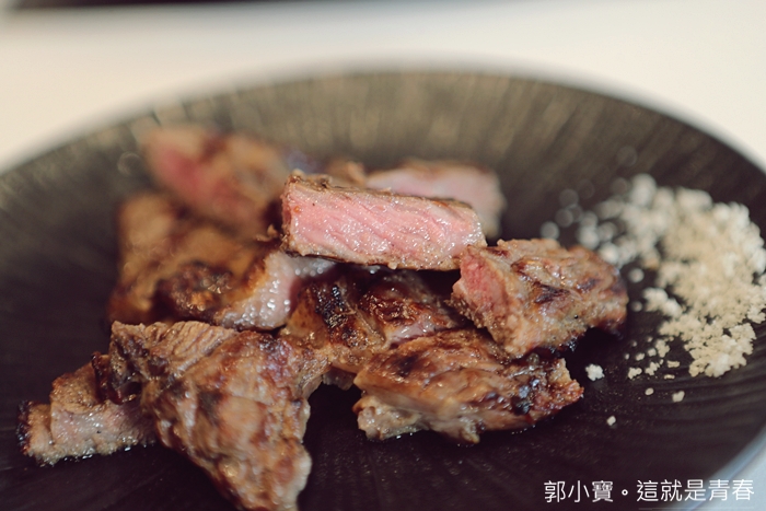 | 提供的鹽是我很喜歡的松露鹽,松露香氣非常重,牛肉吃起來雖然沒有和牛的豐沛油脂跟鮮甜,但是卻有著美牛獨特的肉汁跟口感還有甜度,也很不賴! |
