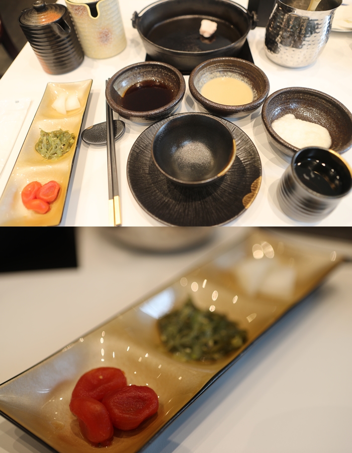 | 餐具的選擇上也都非常貼合日式風格,有點像缽的醬料碗也很道地,是標準涮涮鍋會用的規格,搭配三款開胃小菜,一開始就讓人非常滿意,開胃菜是吃完可以無限續點的。 |
