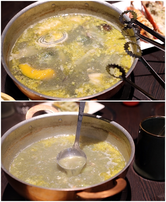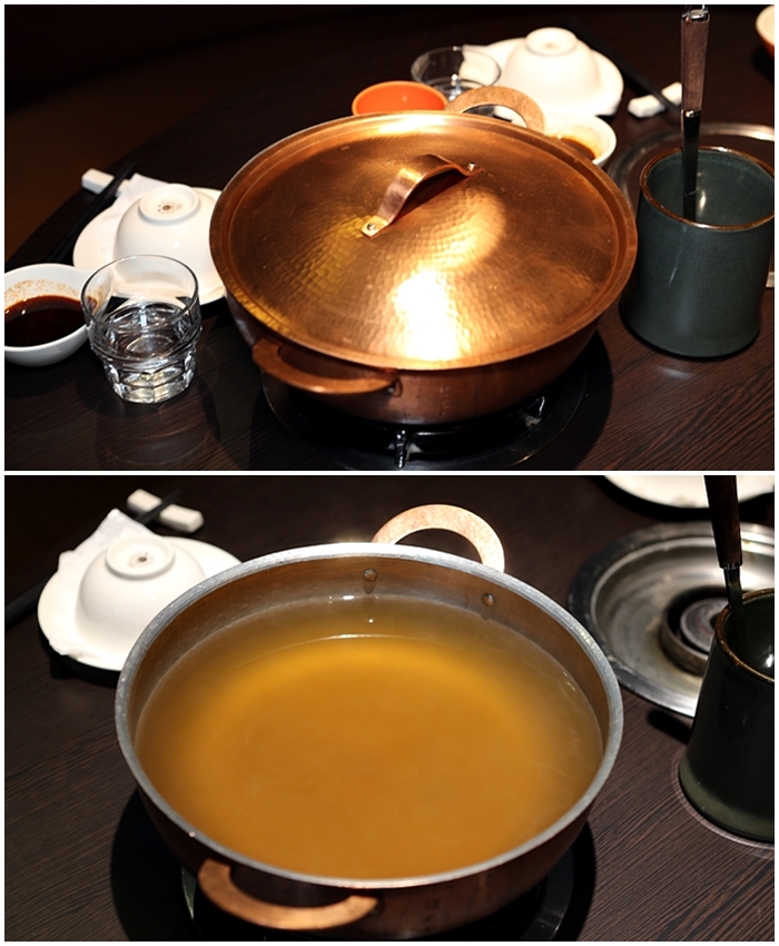 | 銅花精緻涮涮鍋每一個銅鍋都是老闆親自去日本扛回來的,湯頭是昆布湯頭。 |