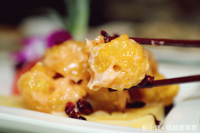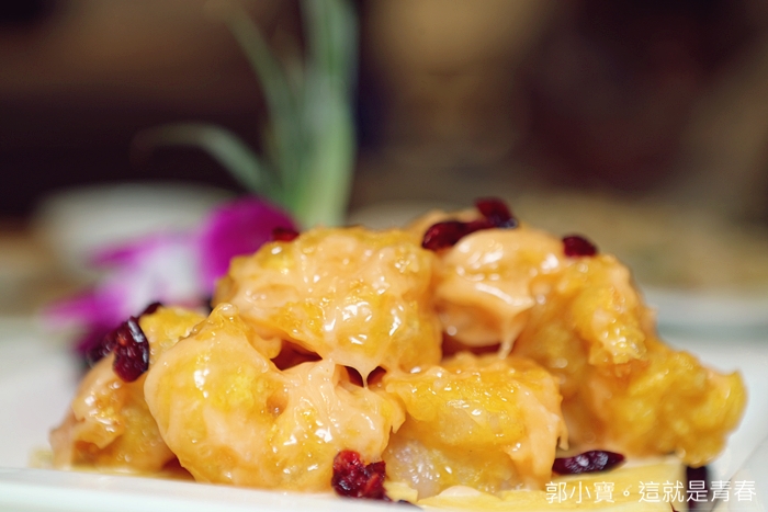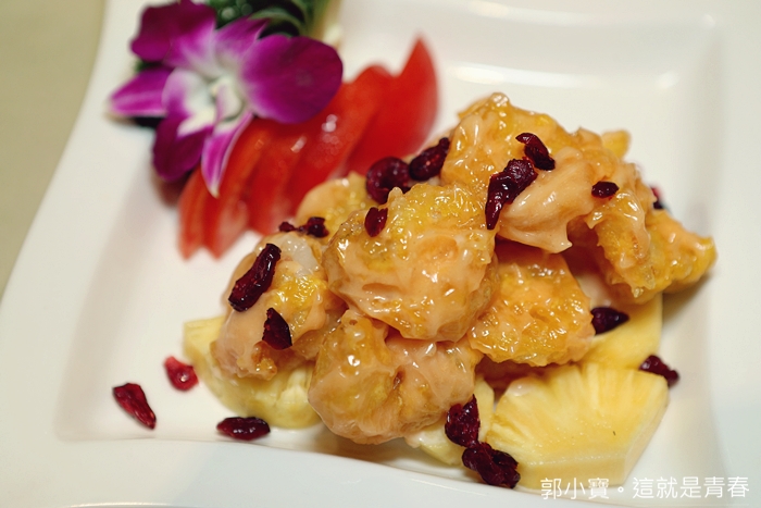 | 真的是用新鮮的鳳梨襯底,蝦子的尺寸非常壯碩彈牙,一口咬下那脆皮的口感還有蝦子彈牙的滋味真的很好吃,是我吃過少數覺得欲罷不能的蝦球,不會過於甜膩,加上蔓越莓果乾更增添了整體的香氣。 |