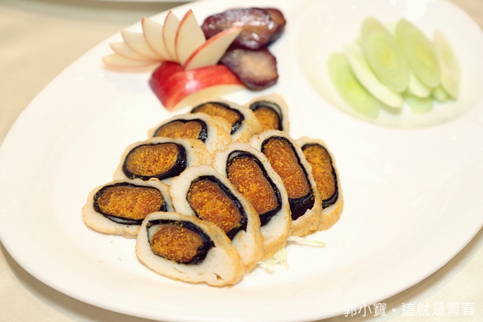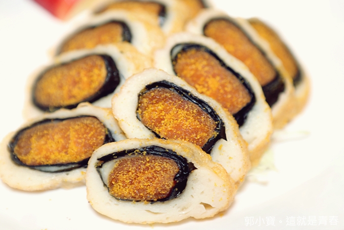 | 服務人員推薦的孔雀烏魚子,品項看起來確實很不錯,口感的呈現在確實很豐富,裡面是烏魚子,中間是紫菜,外層是魚漿,但總覺得紫菜跟魚漿的味道有點搶到烏魚子的味道,但是同行的朋友倒是覺得很喜歡這樣的搭配。 |