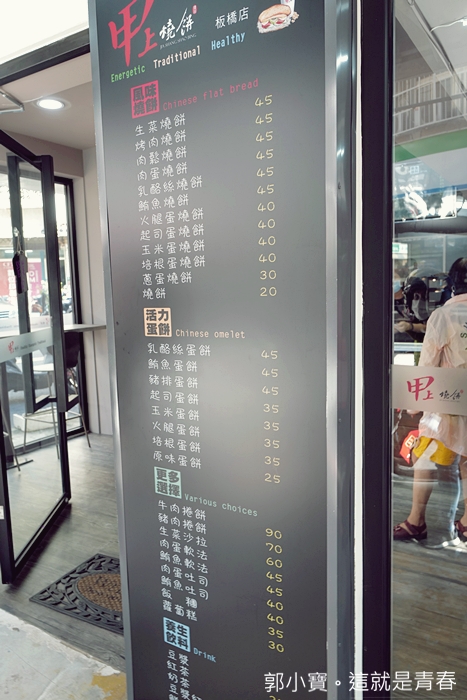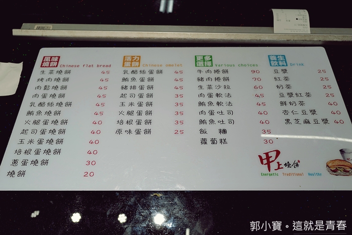 | 到了櫃台前面仔細的看了一下菜單,甲上燒餅除了中式常見的早餐以外,還有西式軟法跟捲餅算是比較特別的餐點,蛋餅的種類也不少。 |