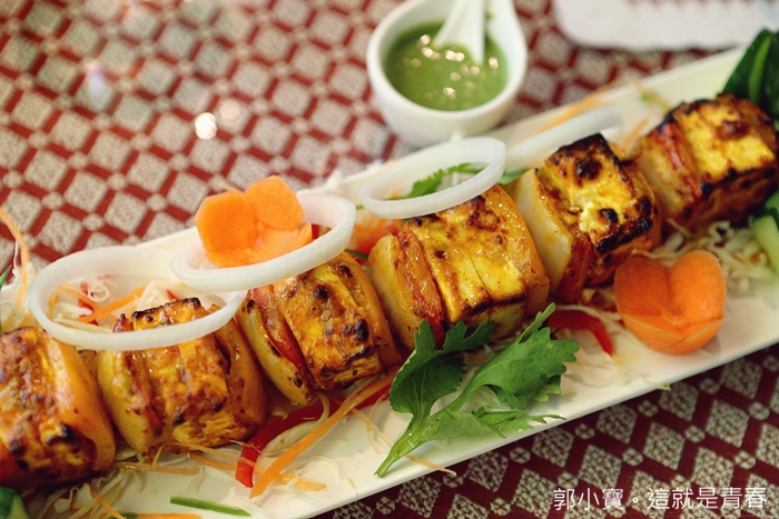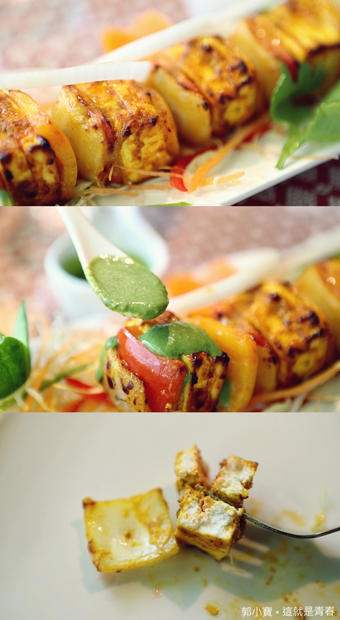 | 這也是我第一次看到的印度料理,奶酪炭烤真的看起來就很有趣,所以就手殘的點了一份來試試看,實體看起來的賣相很好,淋上搭配的醬料跟單吃味道都不一樣,奶酪吃起來的感覺口感偏紮實,細細咀嚼有淡淡的炭烤香氣跟奶酪的滋味,但是搭配洋蔥整體的豐富度較佳。 |