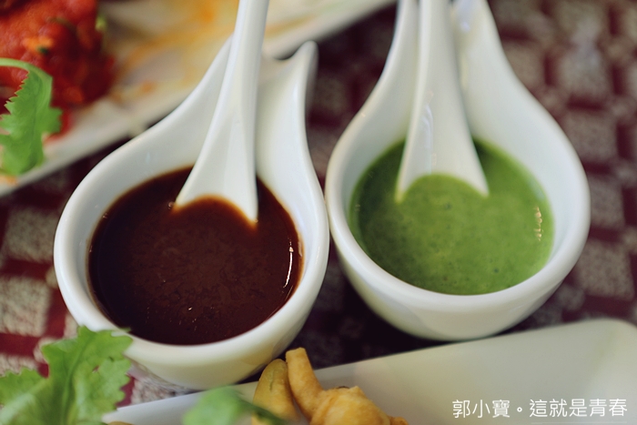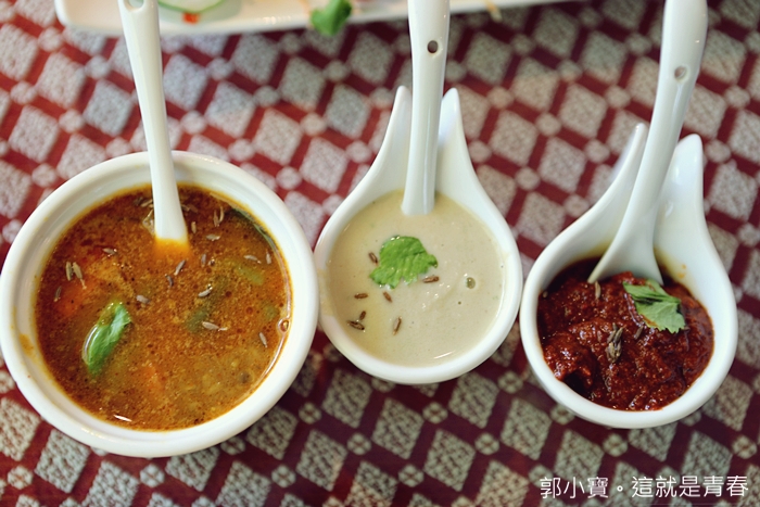 | 印度料理就是會搭配很多特製的香料醬汁,所以到最後我們也真得眼花撩亂,到底哪個醬汁搭配哪道菜都有點混亂了。 |