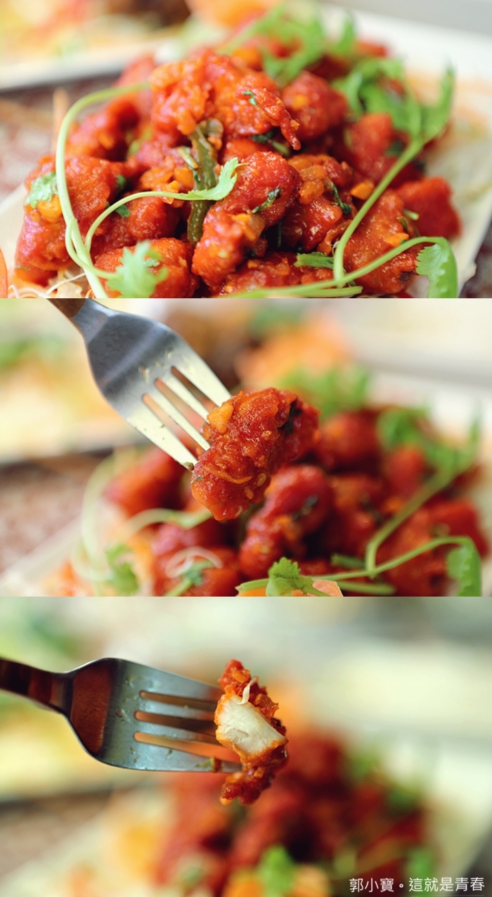 | 這道菜我跟太妃都超喜歡,老實說他比較像中菜,有點像是糖醋里肌的感局,雞丁非常的嫩,外層裹著脂肪層的感覺,水嫩彈牙的口感讓人一口接著一口停不下來,這一道我個人推薦必點!! |