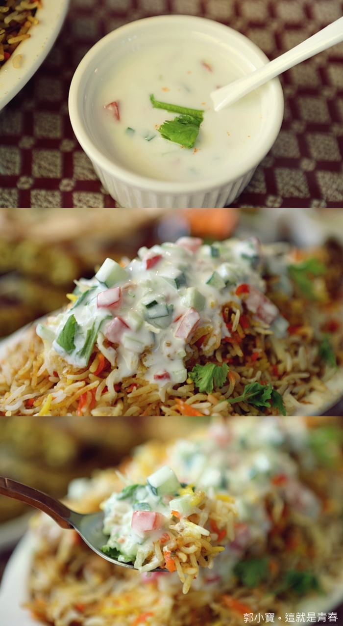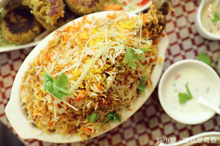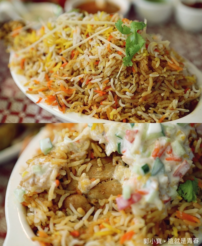 | 這雞腿特味飯視覺效果真的是滿分,裡面還藏有一隻大雞腿以外,印度的米飯都會用香料去炒出其他顏色,米飯看起來本來我還以為是泰國長米,但是仔細看了一下似乎比泰國長米還要長,吃起來的口感也不一樣,米飯的口感也偏較鬆軟一些,我是吃不太習慣,不過嬰皇倒是還滿喜歡的。 |
