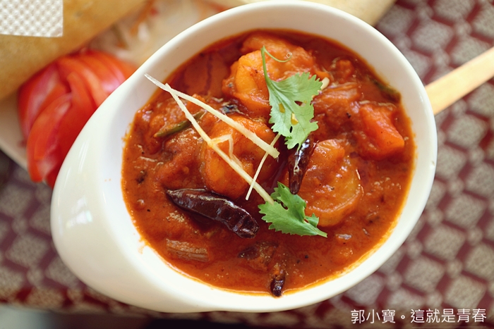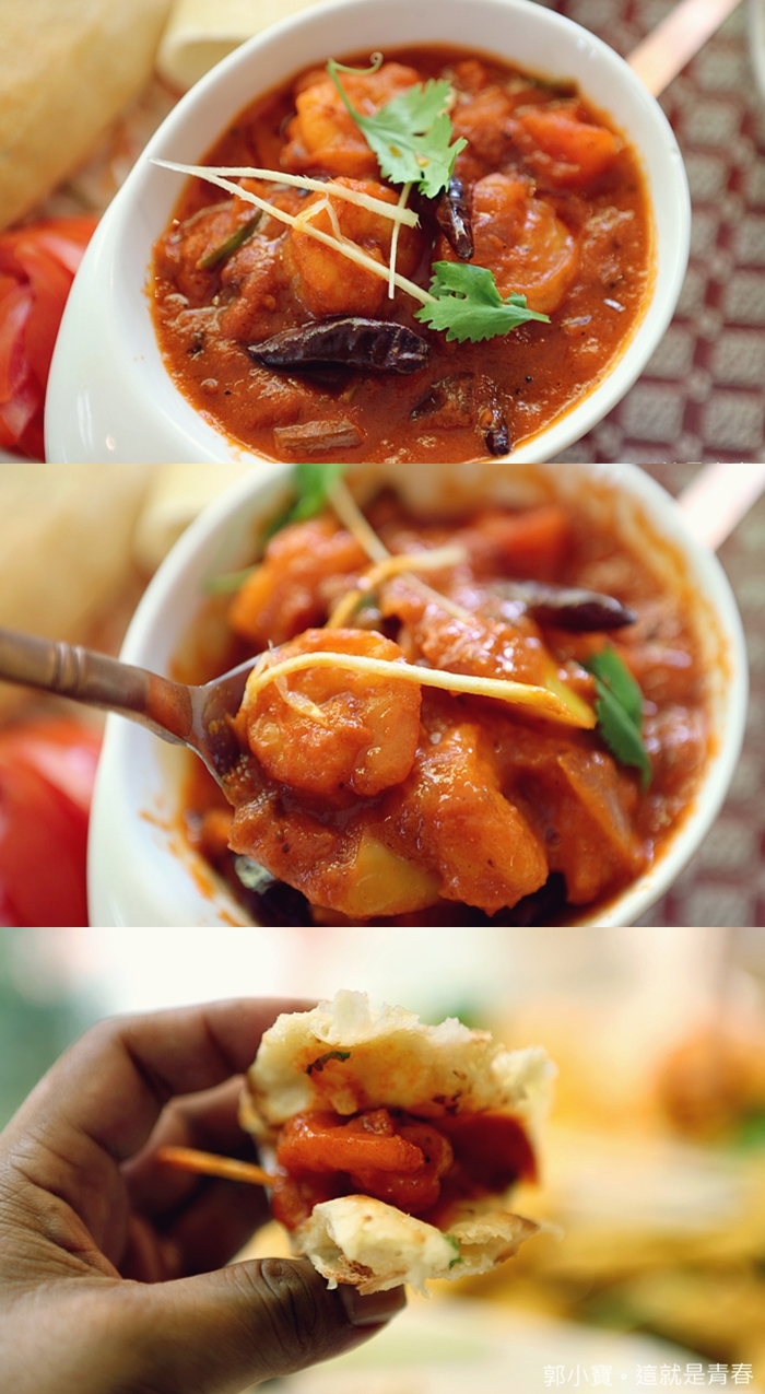 | 因為老婆跟嬰皇前面幾樣菜就夠它們吃了,Sree India Palace斯里印度餐廳大部分的菜都不是狠辣或者是無辣,對我來說真的不夠過癮,所以最後幾樣我點了幾款辣味的咖哩要好好的享受一下,蝦仁都非常大隻,尤其辣味咖哩真的太好吃,搭配烤餅真的讓我無法自拔,我超級愛的阿,一整張餅皮跟咖哩都被我吃光。 |