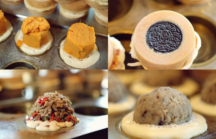| 另一個讓青畑九號豆製所爆紅的原因就是用料絕不手軟,幾乎每個車輪餅的內餡都堆的跟小山丘一樣高,每一個種口味都會讓你咬下的瞬間就感受它的內餡爆漿噴發。 |