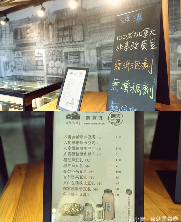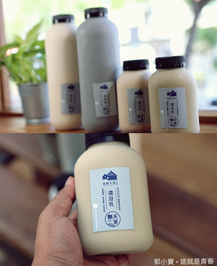 | 青畑九號豆製所另一個要嘗試的新商品就是濃豆漿,這幾年超多豆漿專賣店也越來越受到消費者的喜愛,青畑九號豆製所選擇把他們的原物料跟產地通通公開透明,使用的是加拿大非基改黃豆,完全不添加消泡劑、增稠劑、防腐劑等,讓每個人可以喝到最安心的濃豆漿。 |