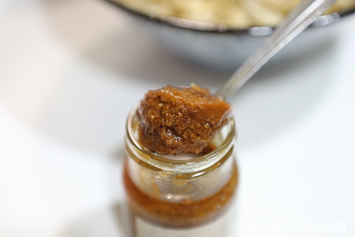 | 將下來當然就是重點靈魂沙茶醬了,將沙茶醬瓶蓋打開後會聽到"啵"的一聲,挖出一大杓沙茶醬就可以看到這沙茶醬的顏色真的太漂亮了,這才是台南府茶的傳統手工沙茶醬,一挖出來就飄出芬芳的味道,真材實料的沙茶醬! |