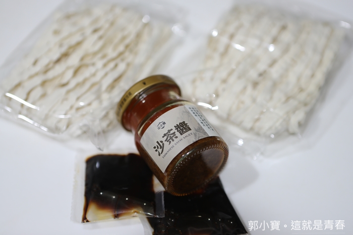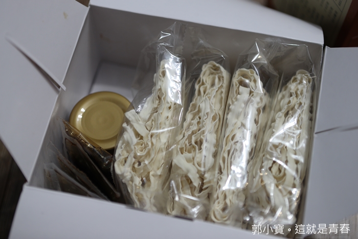 | 打開紙盒就可以看到裡面有四包裸包的關廟麵,他們家有粗麵跟細麵兩種選擇,我個人是偏愛粗麵的口感,所以寄來的就是關廟麵了,除了麵體以外還有一瓶招牌手工沙茶醬跟調味包。 |