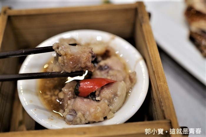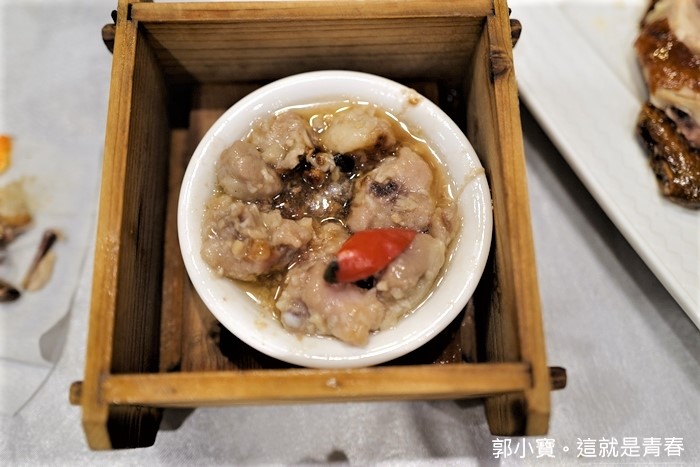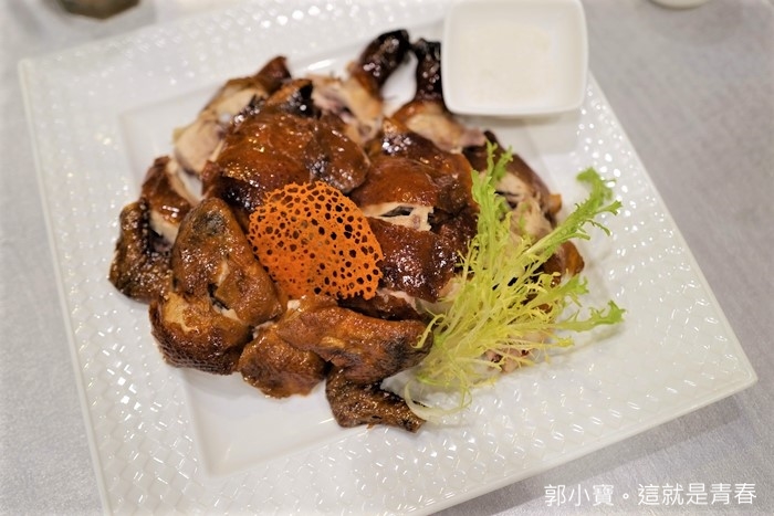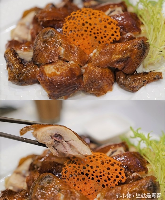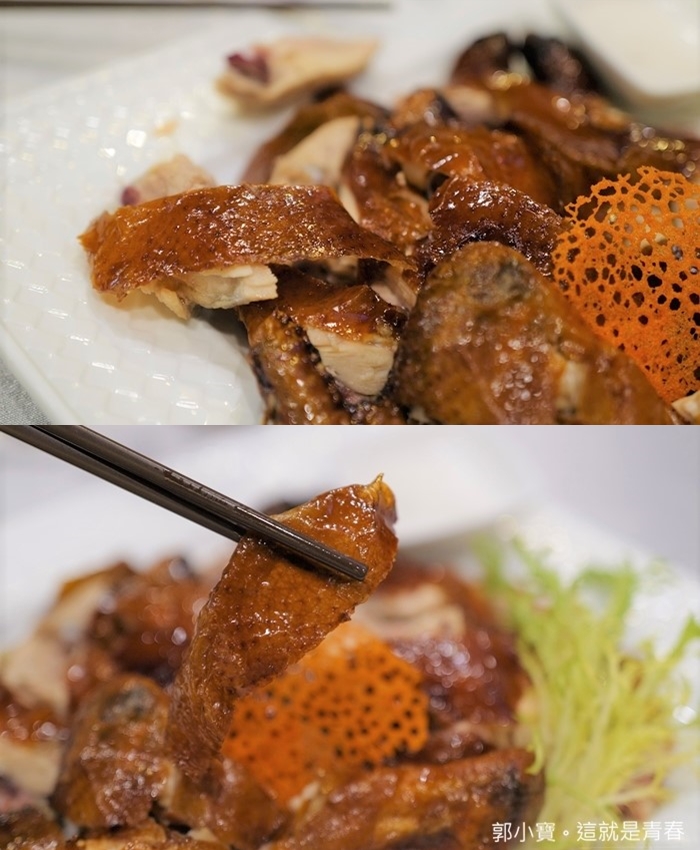 | 其實最吸引我的就是這一道耗時費工的脆皮雞,這兩年吃過幾家飯店的脆皮雞,我個人喜歡的脆皮雞真的都落在高雄的餐廳裡面,黎師傅的脆皮雞就是其中一間,用看的就是麝香味俱全,重點雞肉不會乾柴,一口咬下依然是把肉汁鎖在雞肉裡面,非常好吃!! |