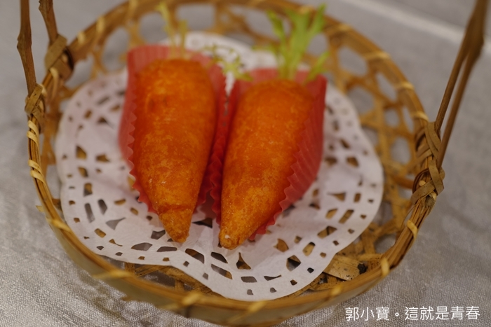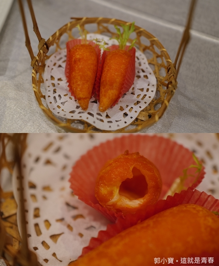| 造型非常可愛,上桌的時候真的會以為是兩跟胡蘿蔔,cola一直很抗拒說不要吃紅蘿蔔,後來咬了一口才知道裡面是起司,些許的起司搭配外酥內軟蘿蔔造型炸物,一整個非常討喜。 |