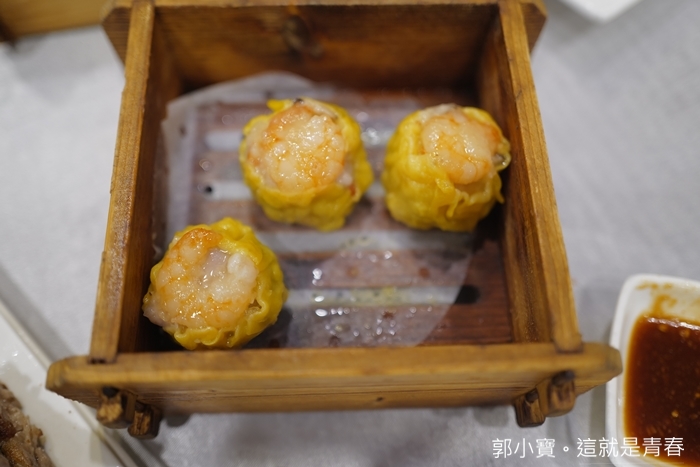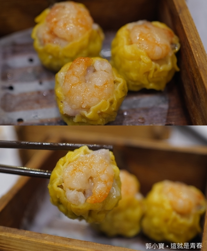 | 超大顆的鮮蝦燒賣,內餡的豬肉非常新鮮沒有豬腥味,燒賣皮厚度恰到好處,一口咬下買買的內餡肉汁還滿鮮甜的,蝦子是使用蝦仁,滿足感十足。 |