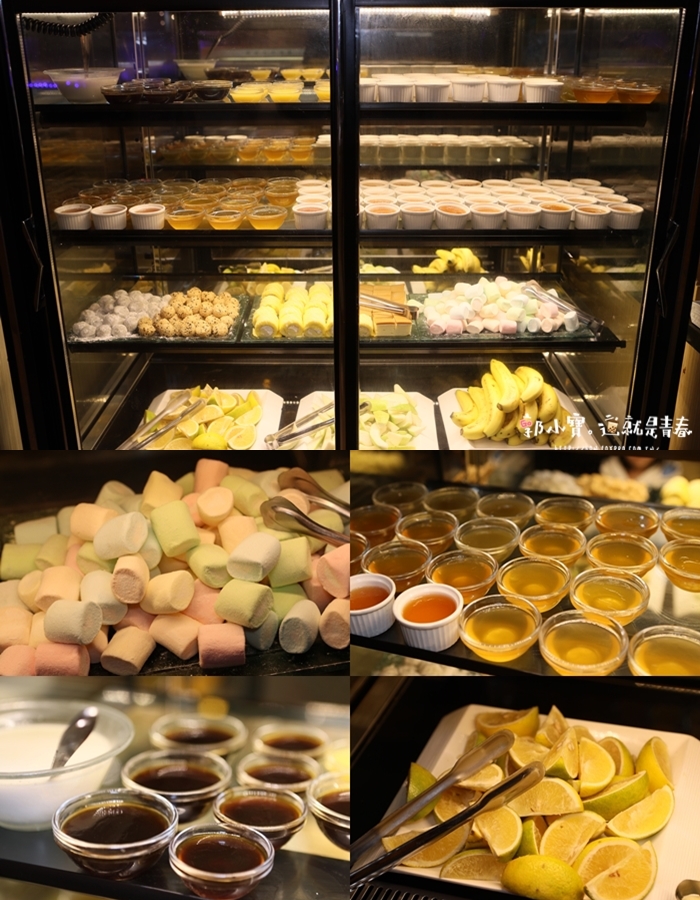 | 冷藏櫃內超多甜點跟水果也都是無限量供應,且工作人員真的都有在注意自助吧的情況,東西一少就會馬上補上,甜點的選擇性還滿多的,茶凍類跟蛋糕類通通都有。 |