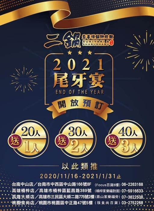 | 現在到一月底還有尾牙活動,20人後每多10人就送1人真的很適合公司聚餐尾牙,省超大! |