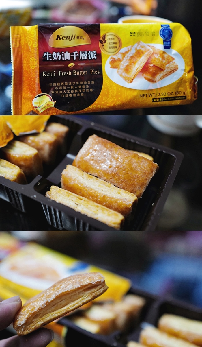 | 紅了一陣子的卡士達派是我家太妃的必買商品,第一次看好像滿多人經過都有買,所以我們就也一起拿一箱回家試試看。 |