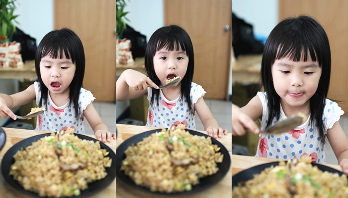 單拍炒飯看不出來,但是放在妹妹面前有比較就很誇張,超大一盤是要怎麼吃的玩,難怪一堆人都外帶回家,Cola也吃得很開心一直說好吃!