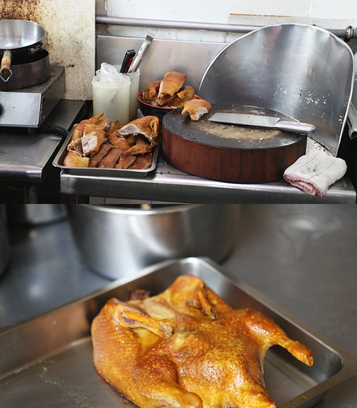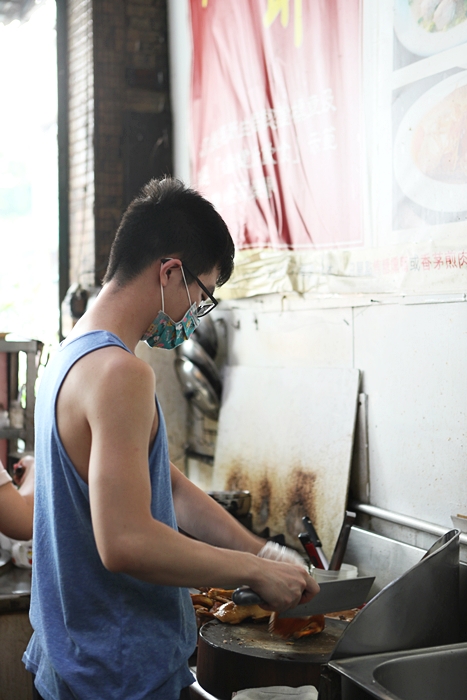 | 這個小帥哥似乎是老闆的兒子,在廚房裡面看起來目前主要是負責它們的招牌焦糖燻鴨的部分,看著小老闆剁鴨剁不停,焦糖燻鴨看起來好好吃感覺!! |