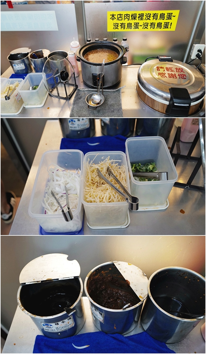 | 店內提供的醬料跟配菜還滿敢給的,蔥薑洋任你夾,沙茶醬油辣椒也應有盡有,另外還有白飯可以讓客人吃到飽,旁邊一鍋滷肉也是可以給客人加白飯,可能有別加的滷肉裡面有鳥蛋,所以老闆還在上方貼著沒有鳥蛋XD |