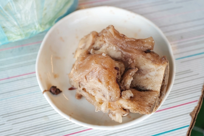 他很認真地回我真的是純大骨去熬出來的,它們店不加奇奇怪怪的東西跟人工味精,邊說邊撈大骨給我看,後來索性就把湯鍋裡面的一塊大骨給我了,說請我吃。