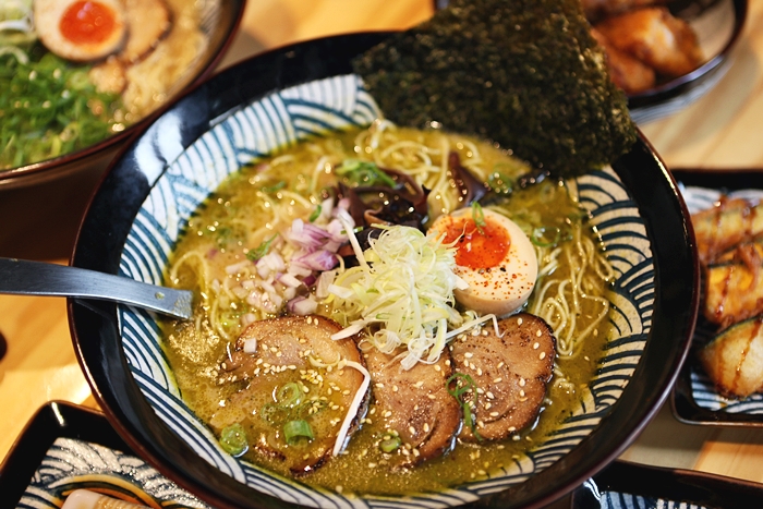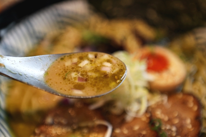| 豚骨青醬的湯頭喝起來頗為特別,濃厚的湯頭中帶點羅勒的香氣,日本風味帶點西餐的配料,也頗受到女生的歡迎。 |