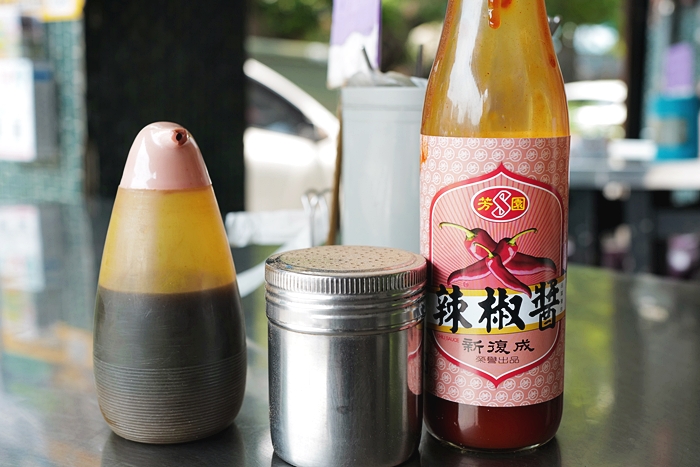 | 每個桌上都有醬料瓶,現在北部的餐飲業大多都只放一組在調料區,大家都要拿著碗走來走去去使用醬料,漸漸的像這樣每一桌都擺的店家越來越少了,本來以為南投也會使用東泉辣椒醬,沒想到是使用這瓶我沒看過的芳園辣椒醬,不知道是不是在地南投人吃習慣的辣椒醬。 |