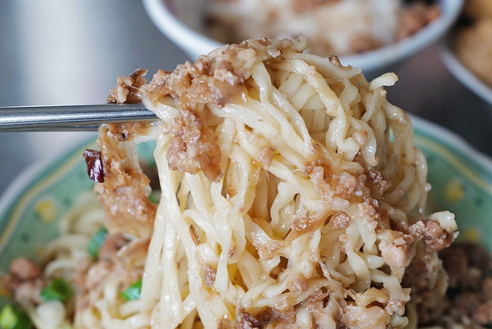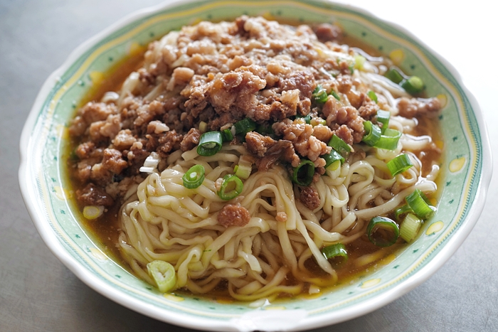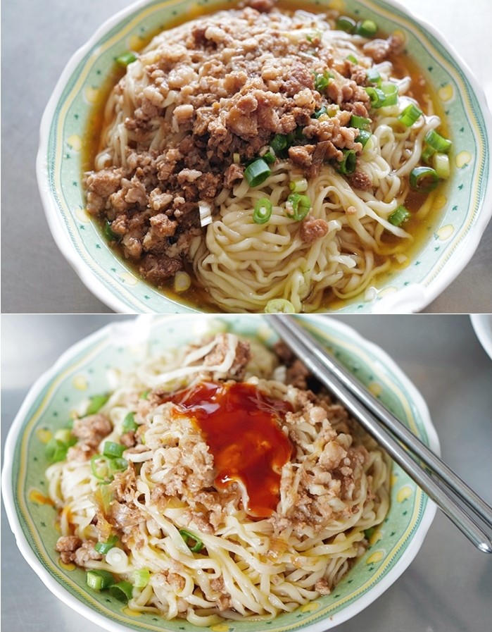 | 老實說,意麵上來的時候我還滿驚訝的,因為我腦中有很多意麵的印象,但這意麵真的讓我有點意外,不知道是不是南投在地的意麵都是這樣的,看起來非常可口,南投意麵似乎跟鹽水意麵不太相同,上面有滿多肉燥,加上蔥花,雖然是乾意麵,但是底下的湯汁也滿多的,我再淋上一些芳園的辣椒醬。 |