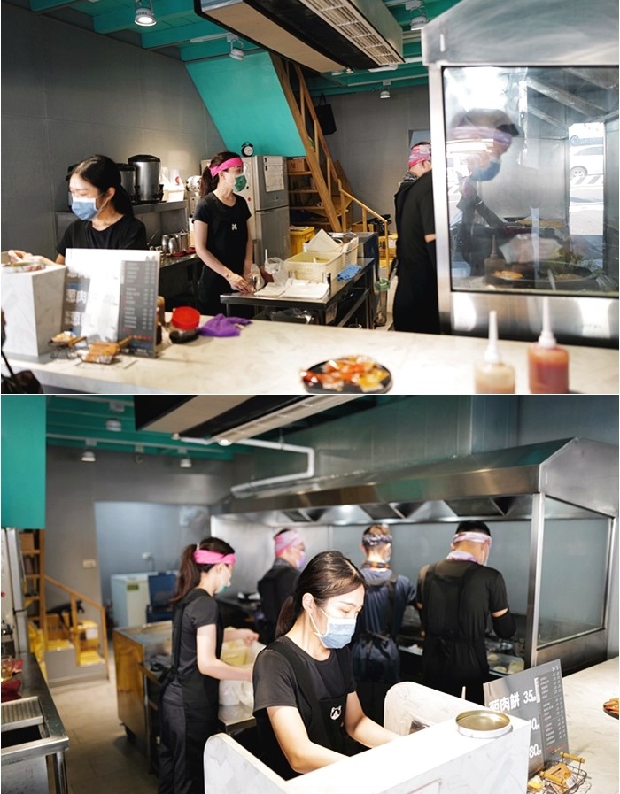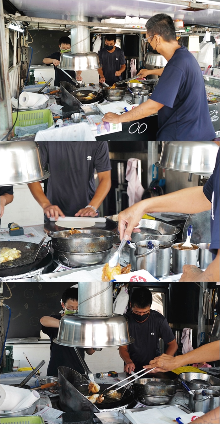 | 攤車內三個人動作很快,但是依然底擋不住源源不絕的訂單,老闆純熟的技術將一份一份蔥油餅裝好,看得我口水直流。 |