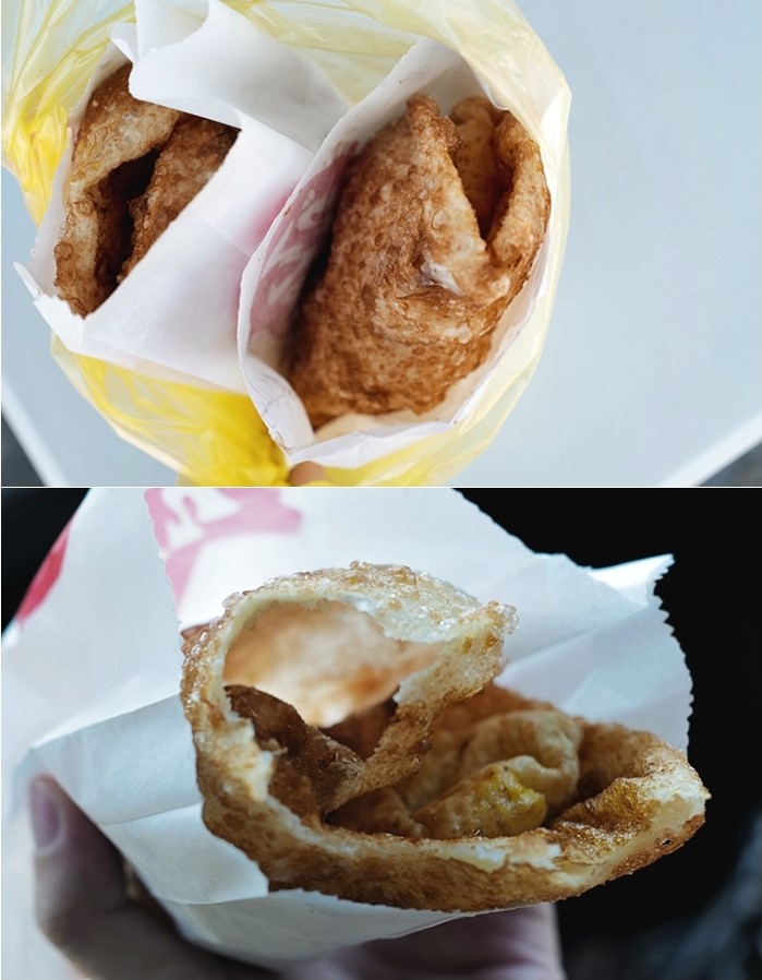 記愣炸蛋蔥油餅的餅皮滿酥脆的,餅皮較薄,咬下去比較沒有咀嚼感,但是非常順口,一口一口瞬間就吃光了。 |