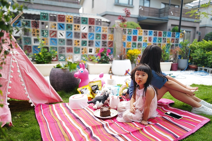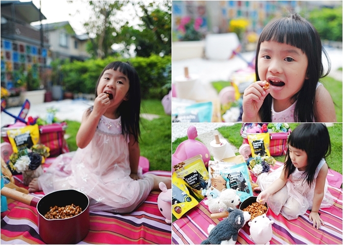 | 出門野餐或是露營的時候,到達目的地我們通常都會先拆一包米米花解一下小朋友的嘴饞,有零食可以吃她們就會安靜許多,Cola也會約她的寵物娃娃們一起辦家家酒吃飯。 |