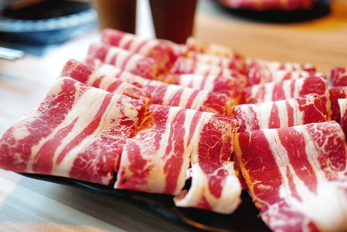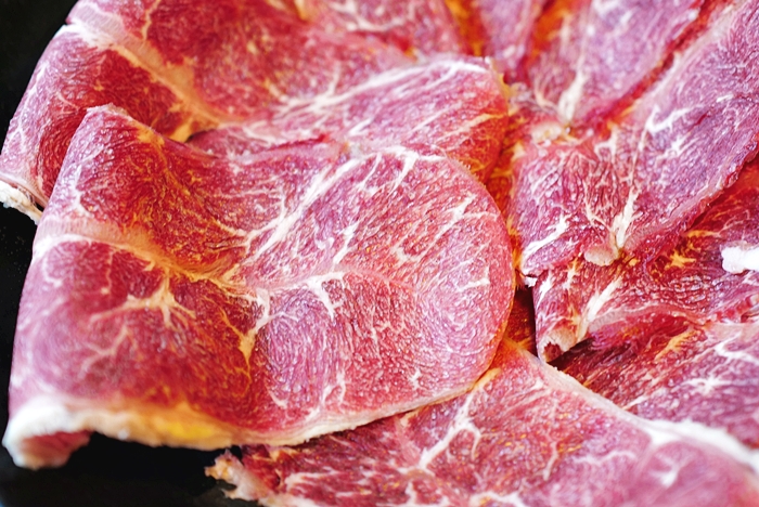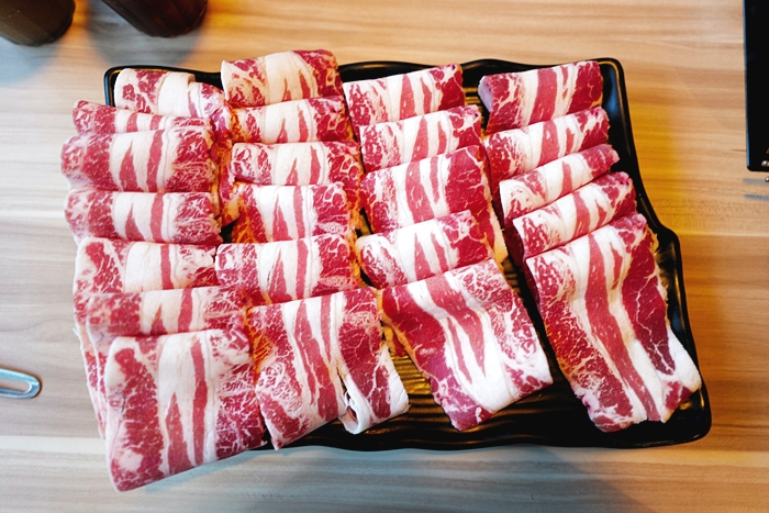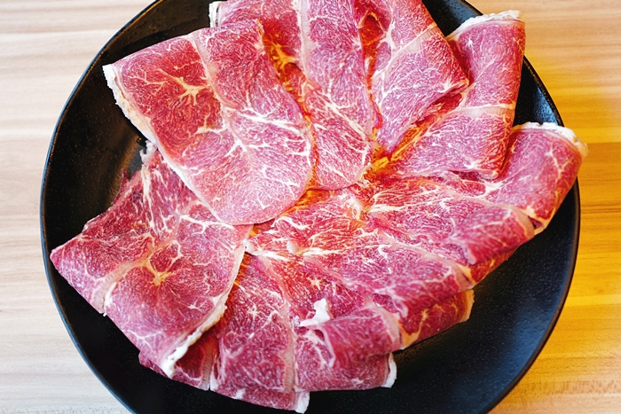 | 樂崎火鍋使用的肉大多都是冷凍肉,油脂看起來分布的也都不錯,也有一定的厚度,燙熟吃起來也挺滿意的,霜降牛太妃表示很OK,她每次來都是點霜降跟六兩松阪豬居多。 |