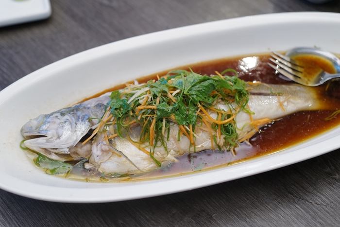 | 這一條魚也是值得推薦,使用雞油跟花雕下去蒸,當天活跳跳的鮮魚,那魚肉細緻肉汁鮮美,這條魚真的是100分,很久沒吃到那麼鮮美又可口的蒸魚了。 |